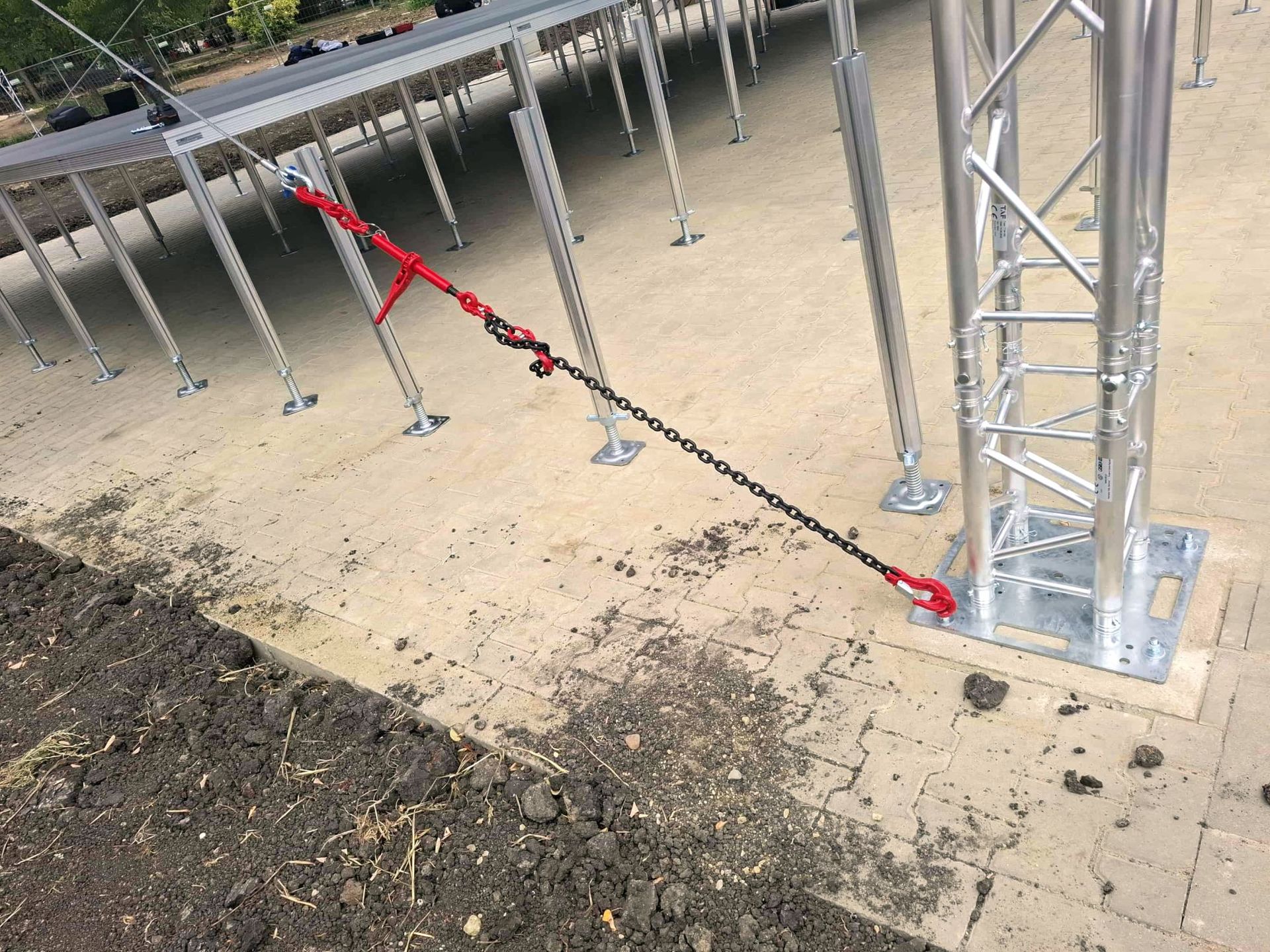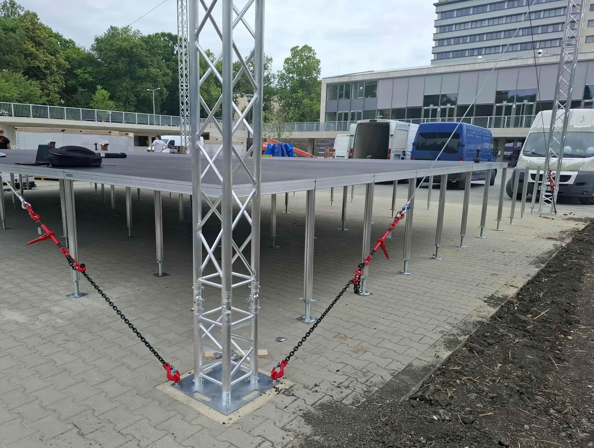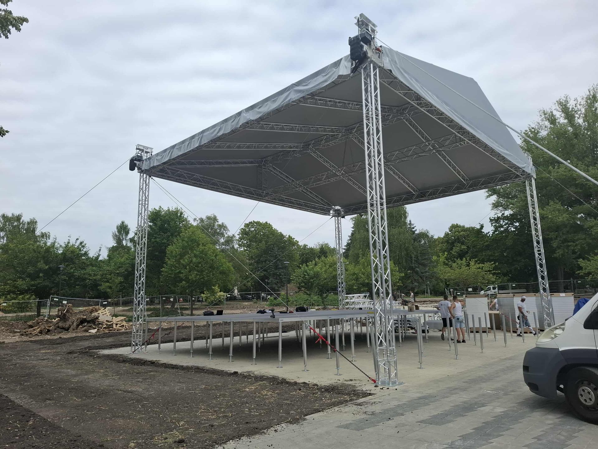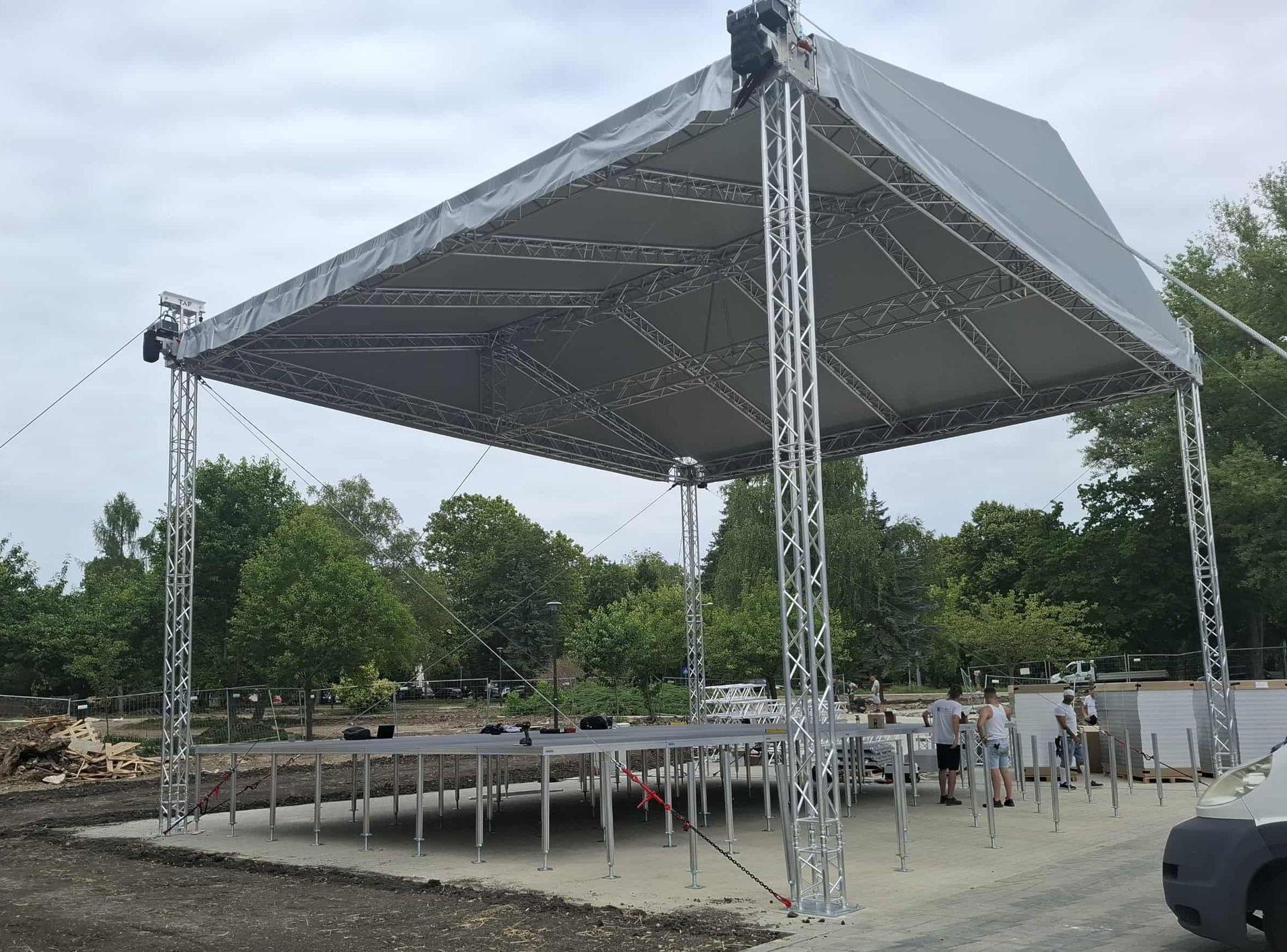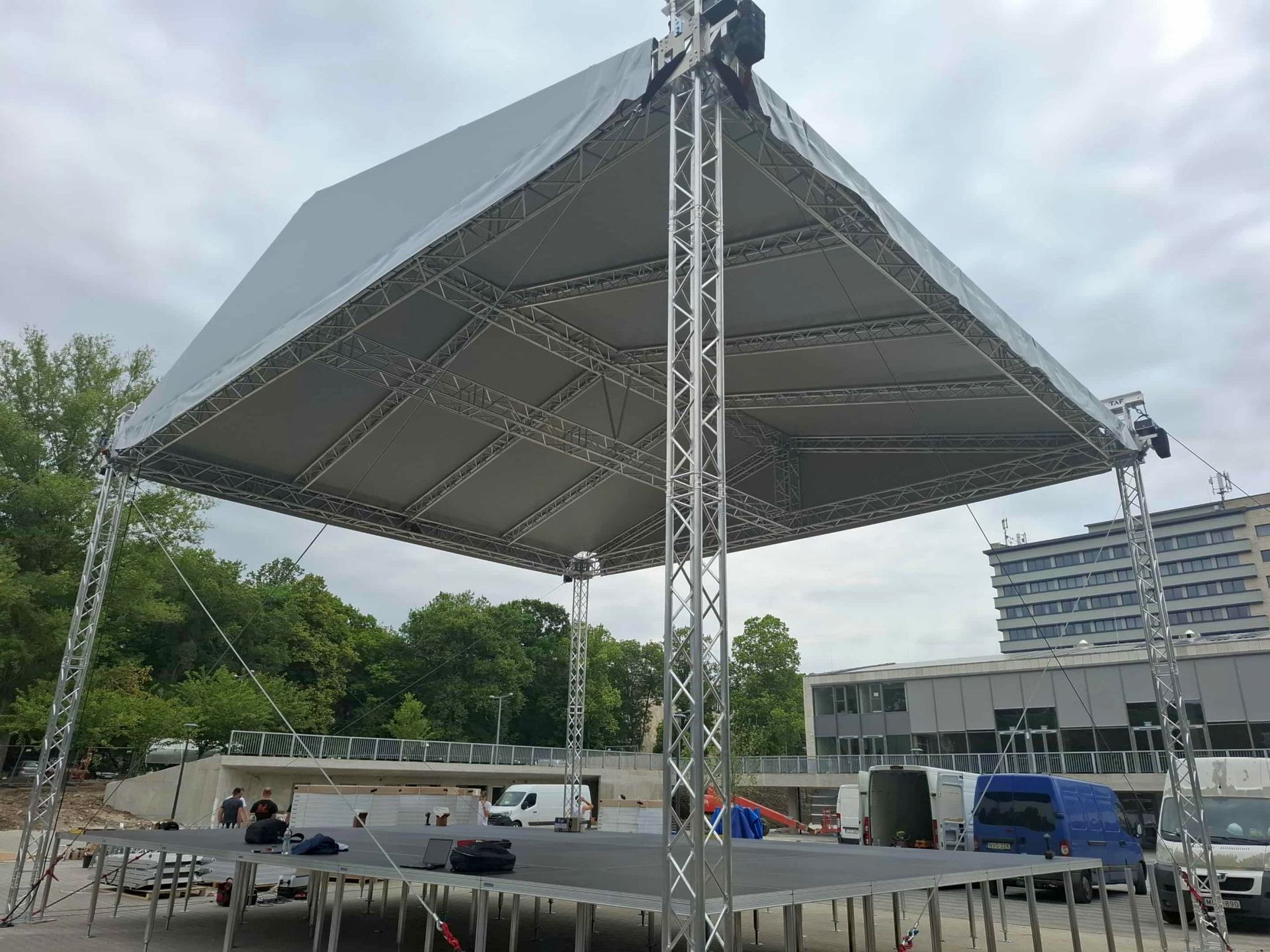 veľkosť strechy 12x10m, pódium 10x7m , použité sú oceľové laná